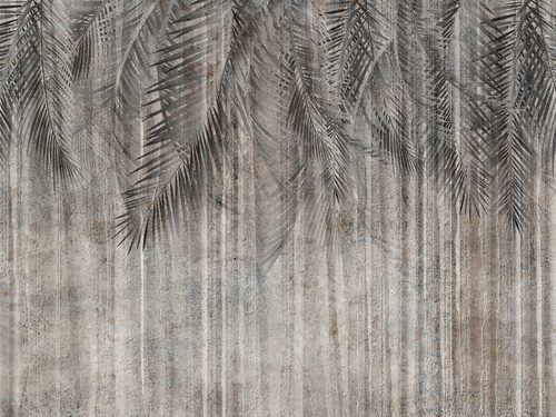 Palm leaves on the wall, tropical leaves. Illustration for wallpaper, card, poster, decoration with beige. Mural.
